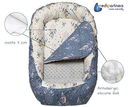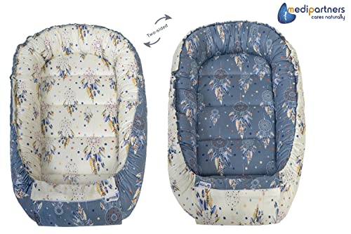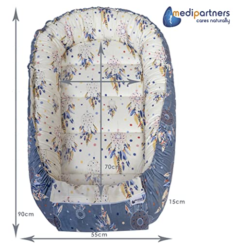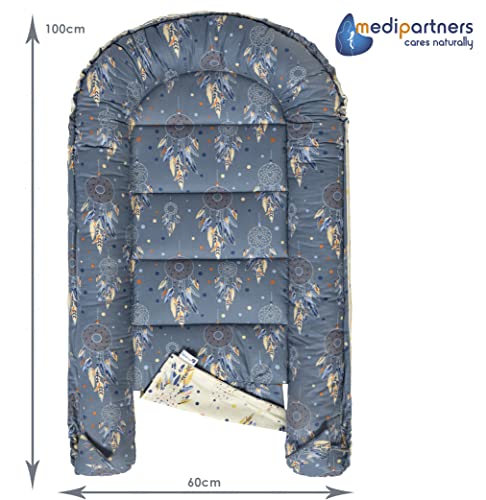 Medi Partners Baby Nest Pod for Newborn Babynest Sleep Bed – 100x60x15 Lounger Essentials 0-12 Months sleeping bilateral Cocoon 100% Cotton (Dreamcatchers with grey Plush)