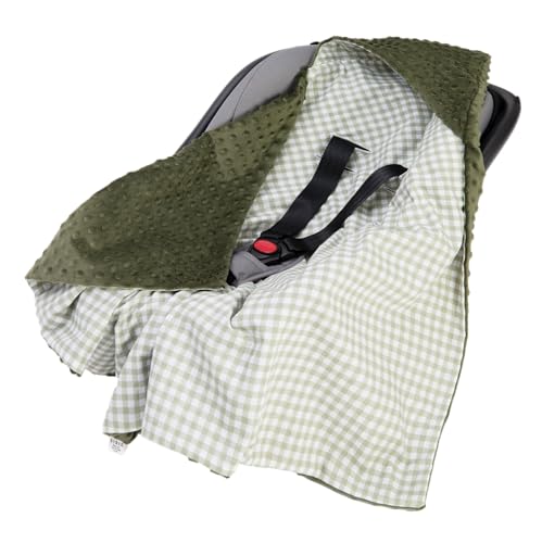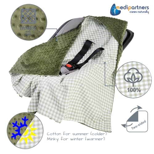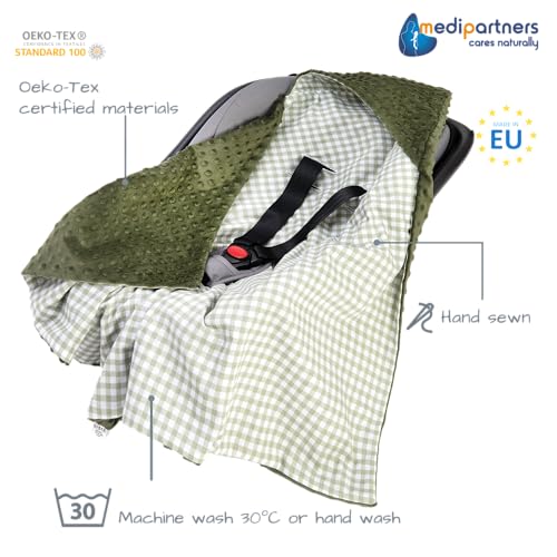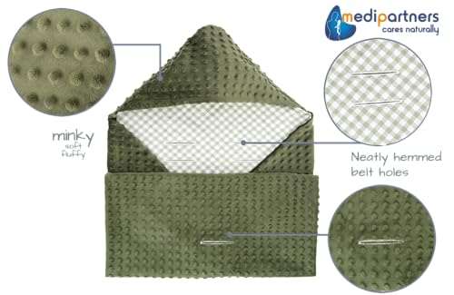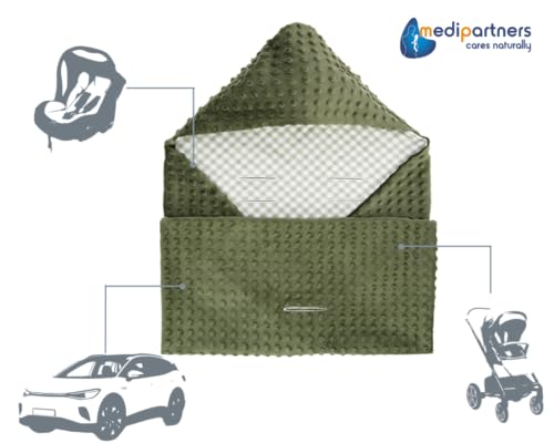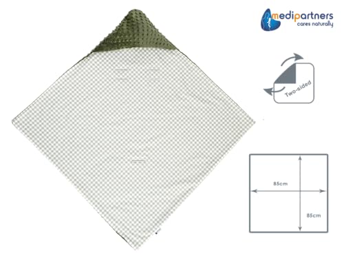 Medi Partners Swaddling Blanket 100% Cotton 85x85cm Double-Sided Multifunctional Plush Blanket With a hood for Pushchairs Soft Fluffy (Grid with olive Plush)