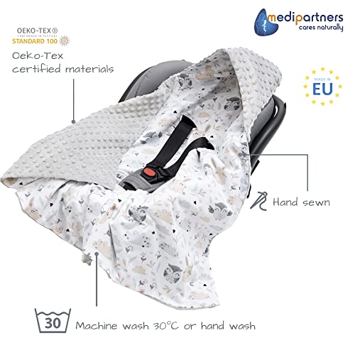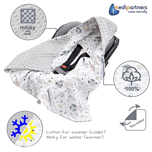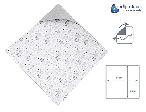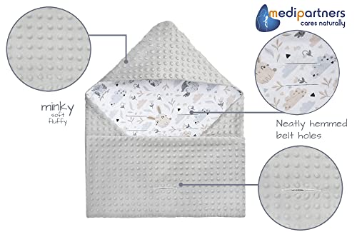 Medi Partners Swaddling Blanket 100% Cotton 85x85cm Double-Sided Multifunctional Plush Blanket With a hood for Pushchairs Soft Fluffy (Glade with grey Plush)