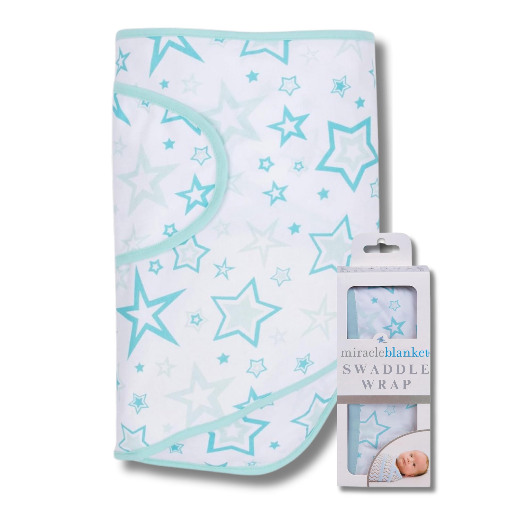 Miracle Blanket Baby Sleep Wearable Swaddle Wrap for Newborn Infant Boy or Girl 0-3 Months, Aqua Stars