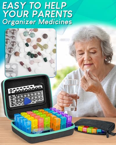 - Travel Pill Organizer: 31-day case with handle, hands-free travel. Protects meds on the go, ideal gift for family members. Includes 31 pillboxes, cutter, mesh bag, stickers, EVA case.