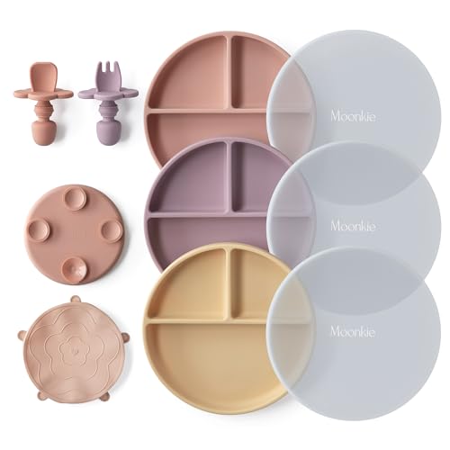 - 【AESTHETIC PLEASING & SATISFACTION GUARANTEED】Moonkie weaning set includes 3 x different colored plates with transparent lids, 1x fork, and 1x spoon, 1x fresh-keeping lid. Available in a range of soft colors, Moonkie toddler plates make meal times fun as you're able to decide what color you want to use that day. We're 100% confident that you and your child will love our Moonkie silicone baby feeding set.