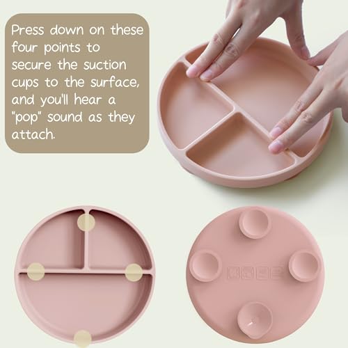- 【END MEALTIME MESS WITH FOUR-POINT SUCTION】Four suction points securely keep the baby plate on any flat surface, encouraging independent self-feeding for your child without a mess. If your little one tries to flip the weaning plate and one suction cup pops off, the other three stay put, giving you a chance to redirect their attention before there's food on the floor.