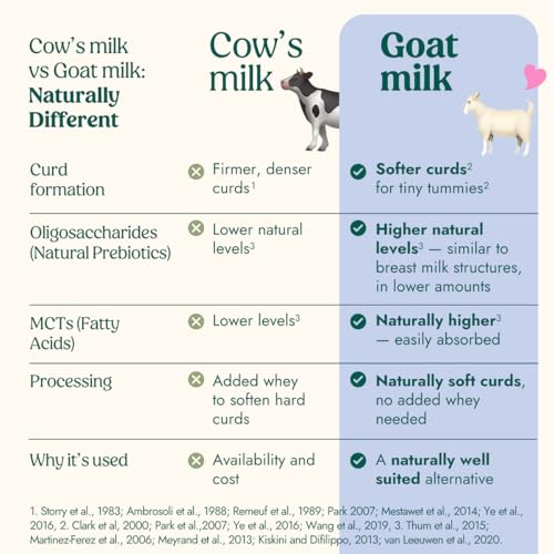 - Naturally Gentle (vs Cow’s milk) – Goat milk has natural properties that more closely resemble breast milk, the gold standard, than cow’s milk. It forms softer curds and contains higher levels of oligosaccharides and MCTs, making it a more naturally suited option for a toddler’s delicate tummy.