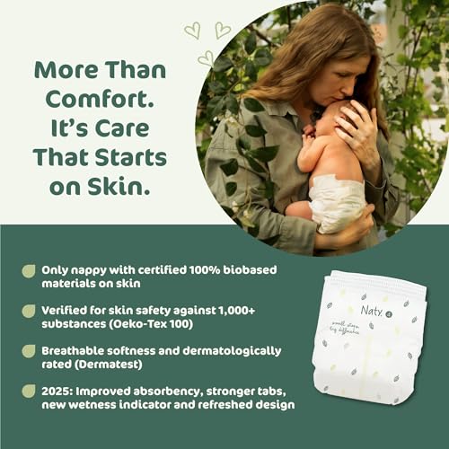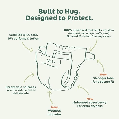 - 100% BIOBASED ON SKIN: The only nappy with 100% biobased materials on skin — topsheet, leg cuffs, ears, and outer layer — certified by DinCertco. No fossil-based plastic touches baby’s skin.
