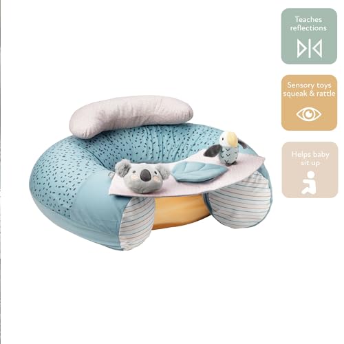 - BABY TOYS – When you’re curious, one has reached the stage where they want to be sat upright to take in their surroundings, they’ll love this floor seat. Watch as they interact and explore the Peek-a-boo mirror, squeaky koala, and jingling parrot.