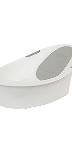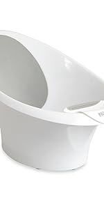 - SECURE – The baby bath has a stylish white and grey, curved design with anti-slip base that keeps the bath securely in place. A handy soft silicone plug is gentle against baby's delicate skin and makes emptying and refilling the water easier