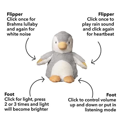 - EASY TO USE – Easy to use by simply clicking pebble the penguin's flippers and feet, with 4 soothing sounds, 3 adjustable volume levels and adjustable light brightness