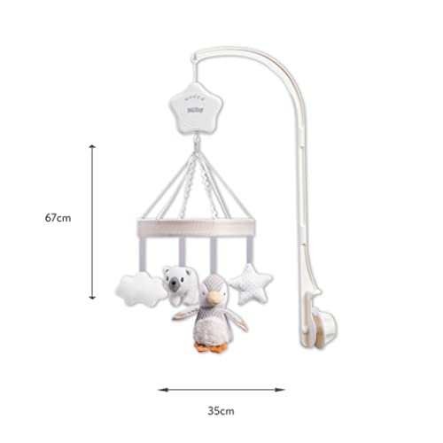 BABY COT MOBILE – Designed to help encourage your little one to fall asleep in no time, it comes with five gentle calming melodies and super cute characters that rotate around to help soothe baby to sleep.EASY CONTROL – The hanging musical star control is easy to use and enables you to switch between the 5 soothing lullabies with on/off button, as well as adjust the volume and control the rotation. Requires 3 x AA batteries (not included in pack).ADJUSTABLE ARM – This baby cot mobile comes with arm that adjusts to fit onto the top bar of your cot (maximum depth 7 cm).SOFT PLUSH TOYS – When your baby reaches up to play with the characters, there's lots of fun in store as the little cloud squeaks, the Pebble the Penguin rattles, the star crinkles and the cute polar bear chimes.PENGUIN COLLECTION – This baby night light is part of our penguin collection; related items are available in our Store.