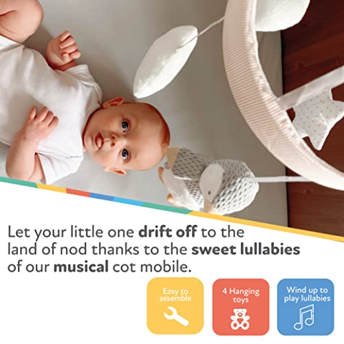 - BABY COT MOBILE – Designed to help encourage your little one to fall asleep in no time, it comes with five gentle calming melodies and super cute characters that rotate around to help soothe baby to sleep.