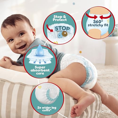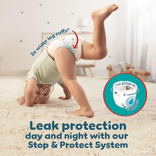 As your baby starts being more active, you want a nappy that can keep up with their new moves. With our revolutionary Stop & Protect System, Pampers Baby-Dry Nappy Pants offer superior all-around leakage protection whatever position your little one gets into – day and night, Pampers Baby-Dry Nappy Pants Stop & Protect System incorporates 2x wider* leg cuffs that help prevent leaks around the legs, a pocket to help stop leaks at the back, a 360° flexible waist design contouring to your little one’s body as they move around, and a super absorbent core offering up to 12 hours of protection. Like all of our nappy pants, Pampers Baby-Dry Nappy Pants are easy to change even when your baby is moving around: just one pull to put on, tear the sides for easy removal, roll up and secure with the tape for easy disposal. Just like you, Pampers put your baby’s safety first: Pampers Baby-Dry Nappy Pants are dermatologically tested and contain 0percent EU perfume allergens (as regulated in the EU Cosmetics Regulation No 1223/2009). They are approved by the dermatologists of the Skin Health Alliance and tested and certified according to Standard 100 by OEKO-TEX. Want to know more about the components Pampers uses? Visit Visit offcial Pampers webside (*vs before)
