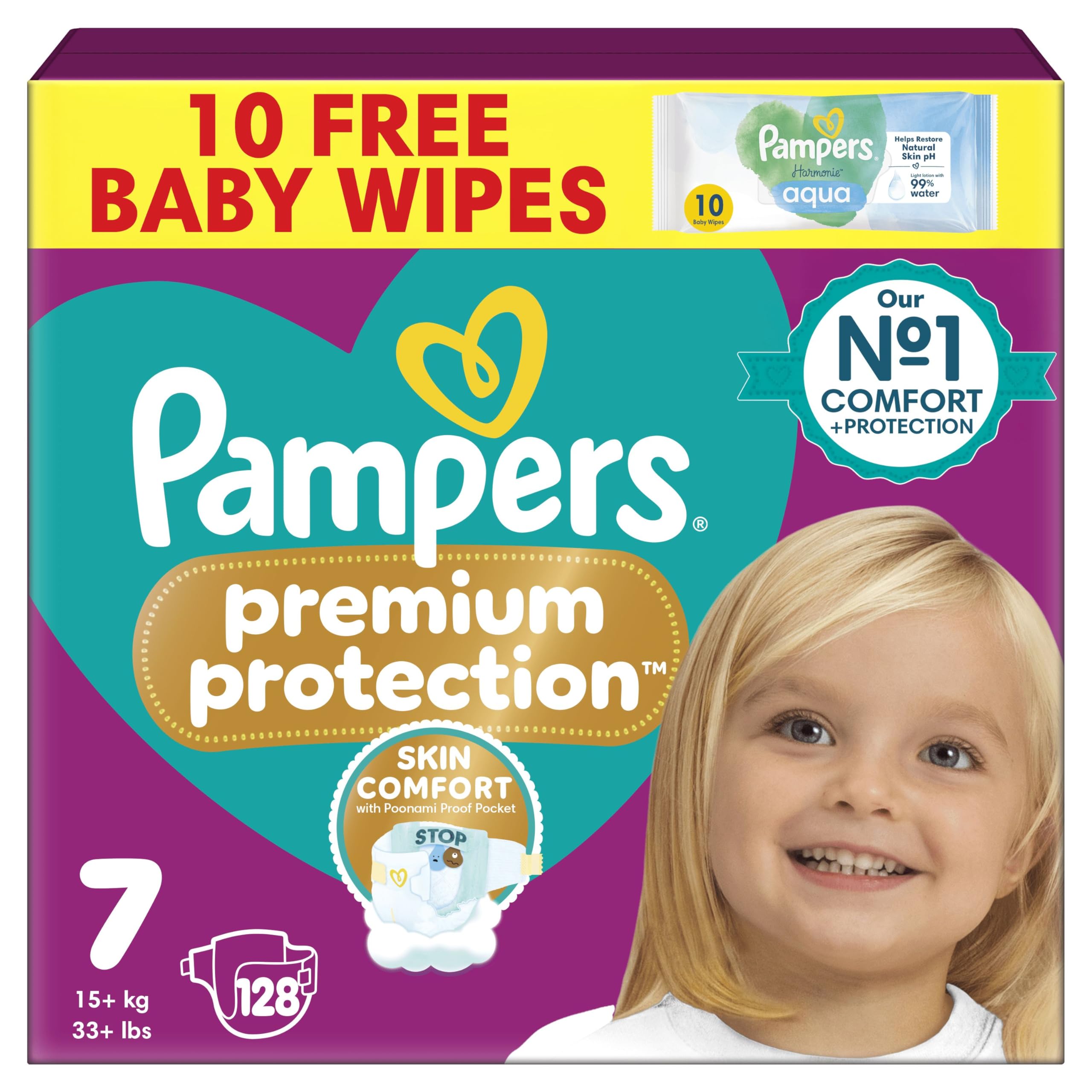 Pampers Premium Protection Size 7, 128 Baby Nappies, 15kg+, Monthly Pack + Pampers Harmonie Aqua Baby Wipes 1 pack of 10 Wipes