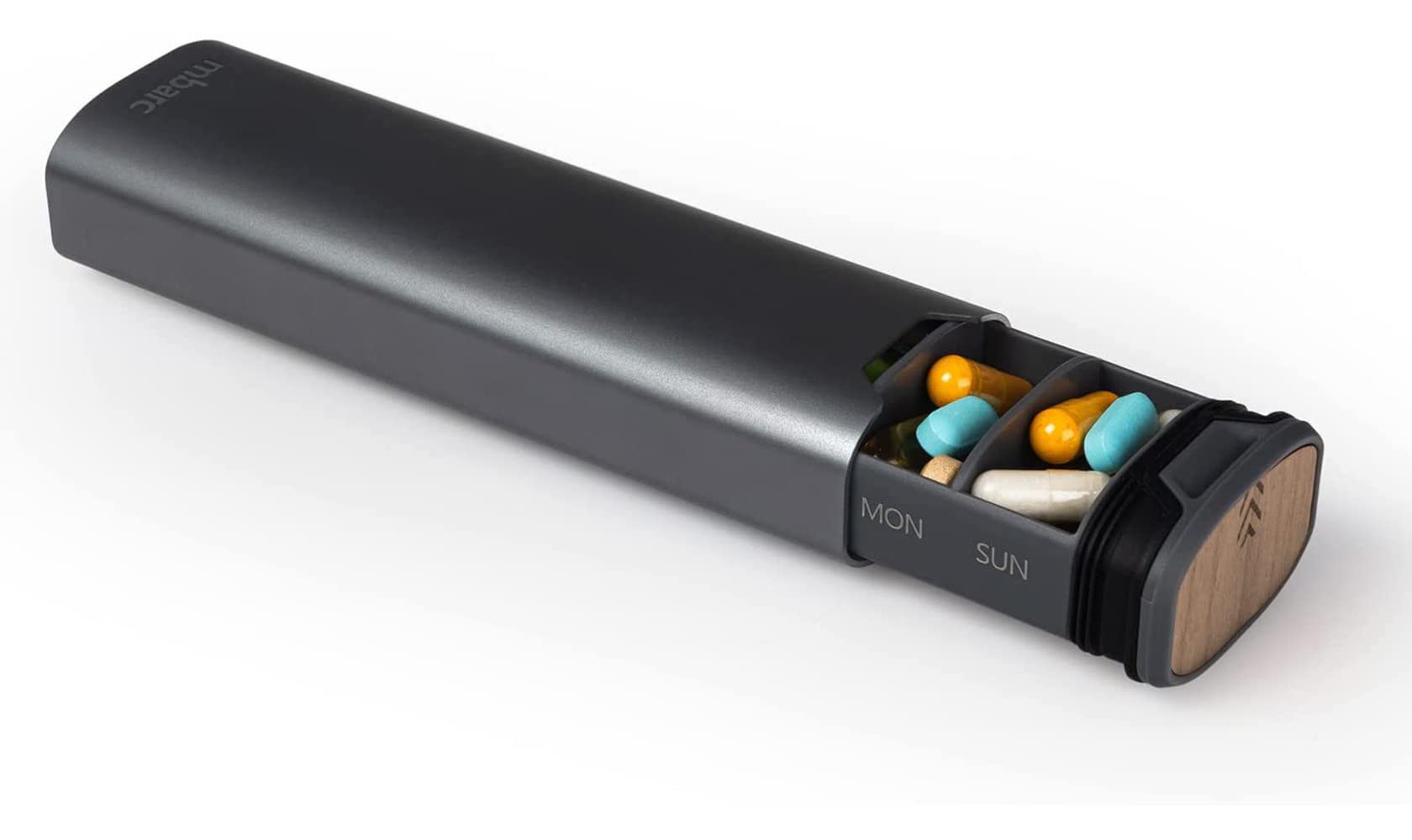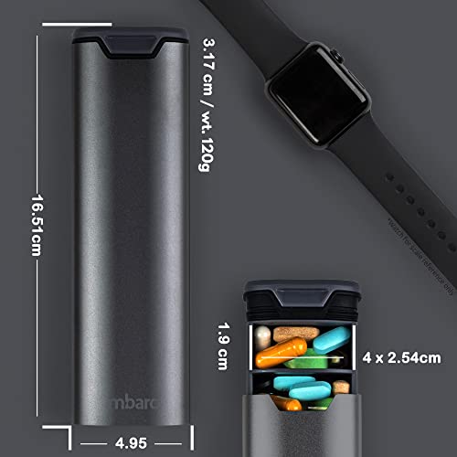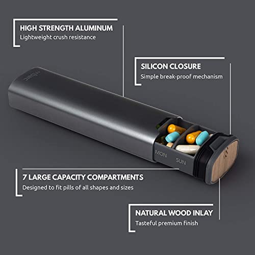 - PREMIUM MINIMALIST STYLE – The mbarc pill container is crafted from ultra-strong and light anodized aluminum tubing. It features a durable polymer slide out pill tray that will safely and securely organize your pills. The clever silicone rib sealing mechanism means there are no plastic closure tabs to fail or break. Real walnut wood inlaid accents provide class and guarantee your pill case will turn heads as a modern and elegant pill container.