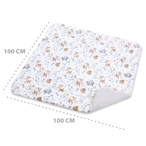 The 100 x 100 cm play mat provides plenty of space for crawling, playing, and relaxing. The 4 cm thick padding protects against cold floors and offers soft comfort. The cotton cover is pleasantly soft, durable, and resistant. Versatile use as a play mat, crawling pad, or sleeping space. Lovingly designed patterns stimulate your child's imagination and curiosity.