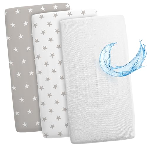 Sheet for Moses Basket Bassinet Crib and Fitted Set of 3: 83 x 50 cm – 2x Sheets + 1x Waterproof Mattress Protector Set Pram Bed Baby Cot Liner Cover Breathable White Gray Stars