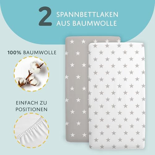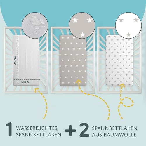 Sheet for Moses Basket Bassinet Crib and Fitted Set of 3: 83 x 50 cm – 2x Sheets + 1x Waterproof Mattress Protector Set Pram Bed Baby Cot Liner Cover Breathable White Gray Stars