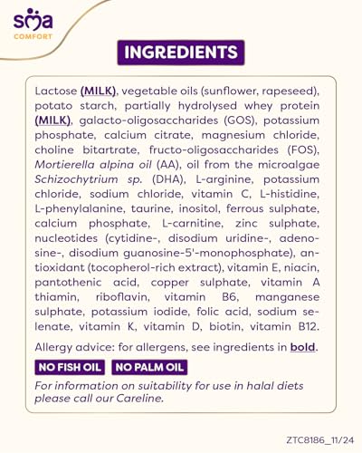Lactose (MILK), Vegetable Oils (Sunflower, Coconut, Rapeseed), Potato Starch, Partially Hydrolysed Whey Protein (MILK), Galacto-Oligosaccharides (GOS), Potassium Phosphate, Calcium Citrate, Magnesium Chloride, Choline Bitartrate, Calcium Chloride, Fructo-Oligosaccharides (FOS), Mortierella alpina oil (AA),Oil from the microalgae Schizochytrium sp.(DHA), L-algirine, Potassium Chloride, Sodium Chloride, Vitamin C, L-Histidine, L-Phenylanine, Taurine, Inositol, Ferrous Sulphate, Calcium Phosphate, L-Carnitine, Zinc Sulphate, Nucleotides (Cytidine-, Disodium Uridine-, Adenosine-, Disodium Guanosine-5′- Monophosphate), Antioxidants (Tocopherol-Rich Extract), Vitamin E, Niacin, Pantothenic Acid, Copper Sulphate, Vitamin A, Thiamin, Riboflavin, Vitamin B6, Manganese Sulphate, Potassium Iodide, Folic Acid, Sodium Selenate, Vitamin K, Vitamin D, Biotin, Vitamin B12. NO FISH OIL.NO PALM OIL.