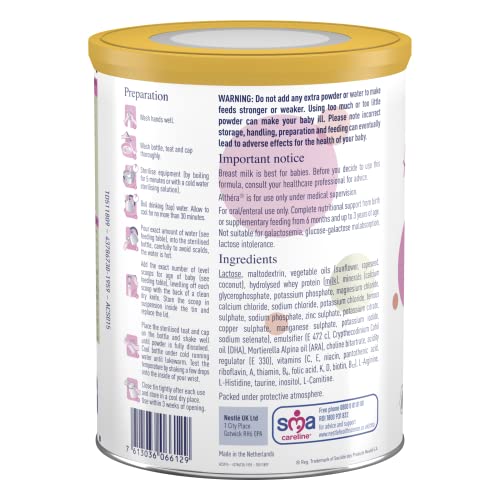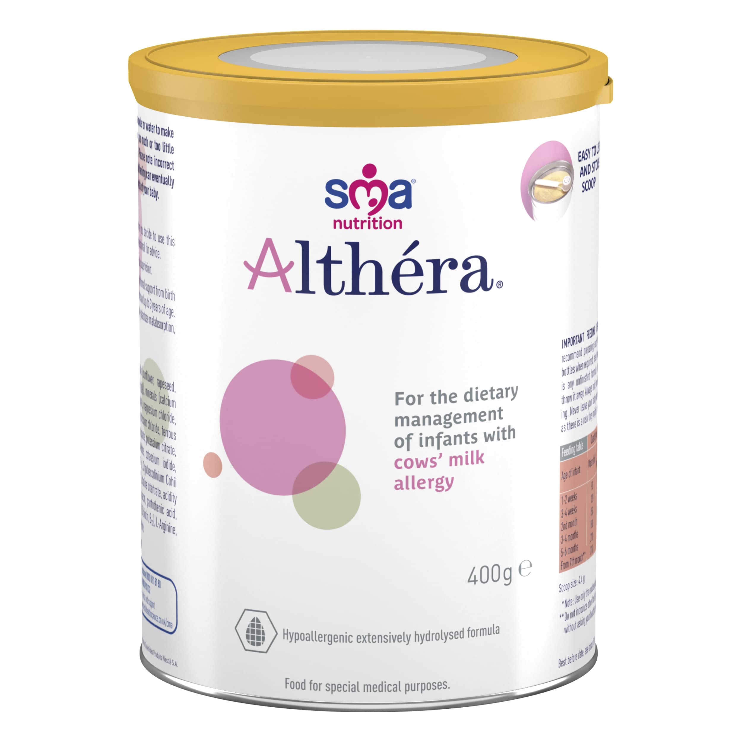 SMA Nutrition Althéra is a hypoallergenic, extensively hydrolyzed powdered formula intended for the dietary management of cow’s milk protein allergy. It is suitable from birth or for supplementary feeding from 6 months up to 3 years of age.