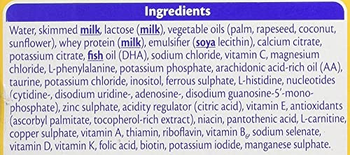 Water Skimmed Milk Lactose (Milk) Vegetable Oils (Sunflower, Coconut, Rapeseed) Whey Protein (Milk) 2′-Fucosyllactose (2’FL) Calcium Citrate Emulsifier (Soya Lecithin) Potassium Citrate Fish Oil (DHA) Sodium Chloride Magnesium Chloride L-Phenylalanine Vitamin C Choline Chloride Potassium Phosphate Acidity Regulator (Citric Acid) Taurine Inositol Potassium Chloride L-Histidine Nucleotides (Cytidine-, Disodium Uridine-, Adenosine-, Disodium Guanosine-5′-Monophosphate) Antioxidants (Tocopherol-Rich Extract, Ascorbyl Palmitate) Ferrous Sulphate Zinc Sulphate Vitamin E L-Carnitine Niacin Pantothenic Acid Copper Sulphate Vitamin A Thiamin Vitamin B6 Manganese Sulphate Riboflavin Potassium Iodide Folic Acid Sodium Selenate Vitamin K Vitamin D Biotin Vitamin B12