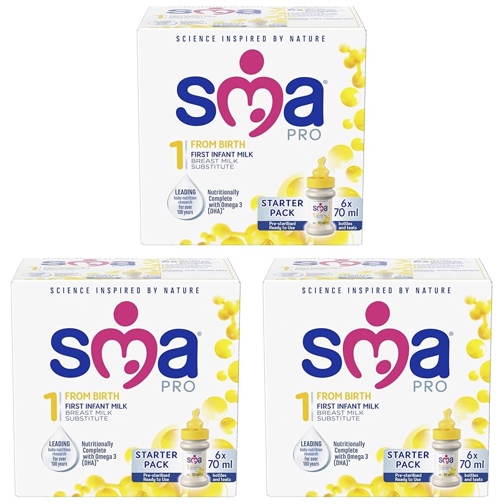 SMA PRO First Infant Baby Milk Starter Pack, Ready to Drink, From Birth (6x70ml) (Pack of 3)