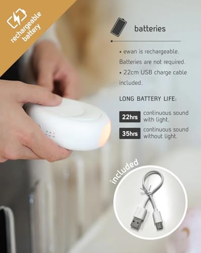 - 10 SLEEP-INDUCING WHITE & PINK NOISE SOUNDS: Ewan’s 10 mesmerising sounds include WOMB, SHUSH, RAINFALL, HARP LULLABY MELODY, VACUUM CLEANER, OCEAN WAVES, HAIRDRYER, FAN, BIRD SONG, and CAR JOURNEY all combined with Mum’s resting HEARTBEAT to provide an effective sleep aid soother for settling restless babies. Ewan’s sounds can playback continuously or automatically switch off on a 20, 40 and 80-minute timer.