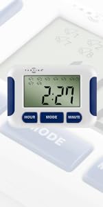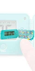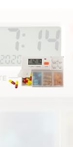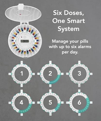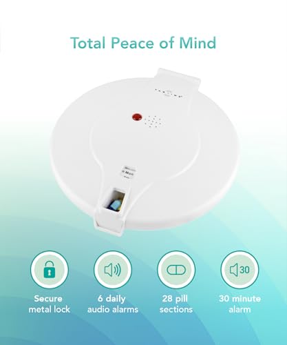 - You fill the device with up to 28 doses of medication and then set up to 6 audio and visual alarms per day for reminders of when the pills need to be taken.