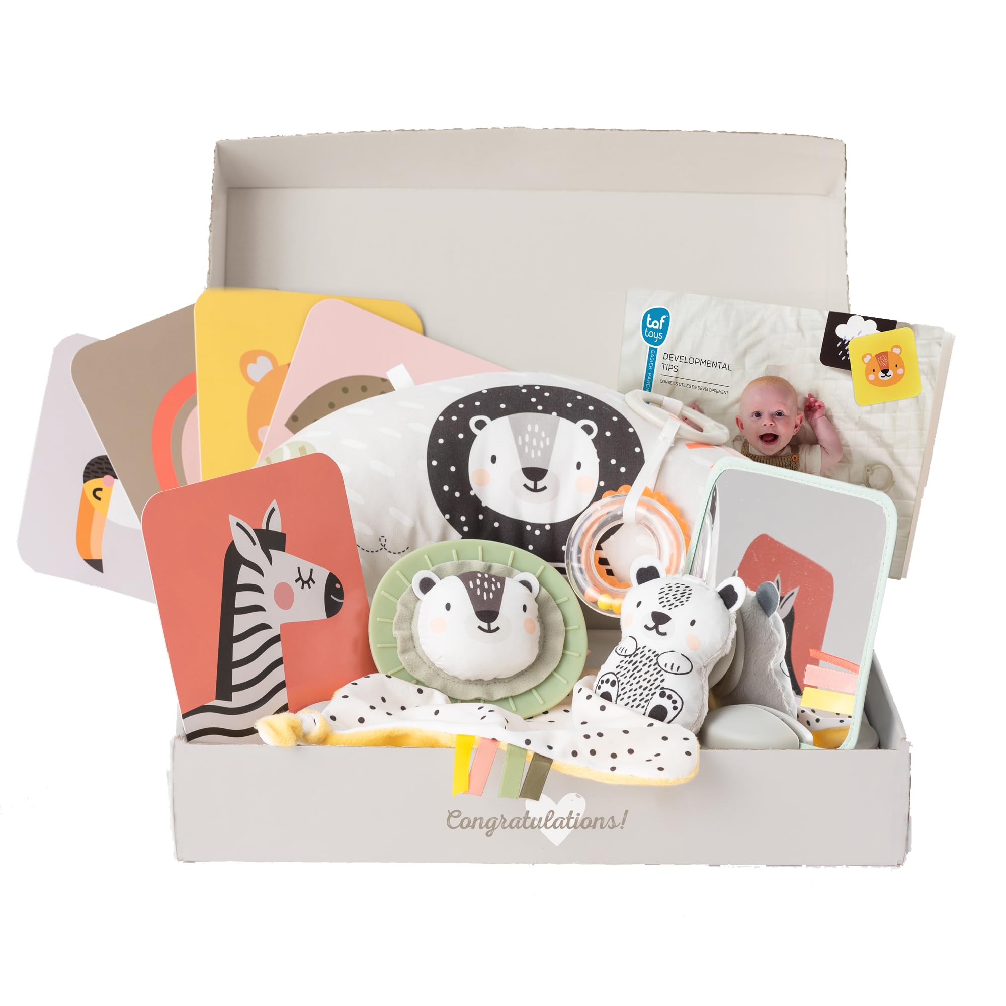 Taf Toys Newborn Gift Set. 12 Piece Baby Sensory Box Includes Tummy-time Pillow, Flash Cards, Baby-Safe Mirror, Lion Cub and Rattle. Baby Development Kit Suitable for Baby Boys & Girls 0 Months +