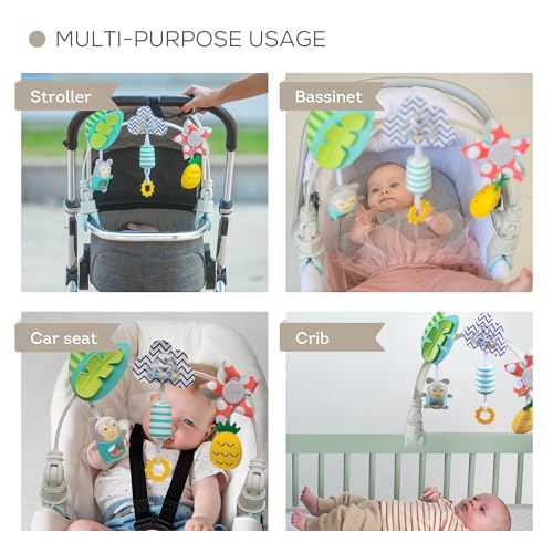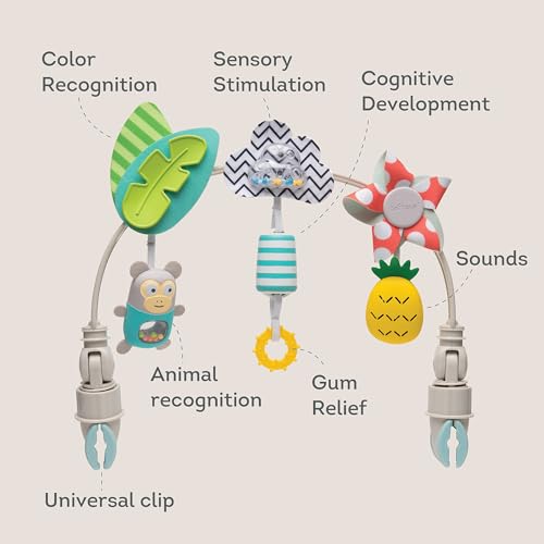 This super flexible and colourful Taf Toys car seat activity toy Tropical Orchestra Arch is full of fascinating musical surprises to stimulate your baby’s discovery of sounds and help develop their sensory and motor skills. The arch contains lights that twinkle whenever your baby touches or kicks any of the toys. In addition, the lovely hanging monkey toy rattles when touched. This will introduce the concept of cause and effect to your baby. Your baby will also enjoy with the chime toy which features a teether, and the pineapple-shaped musical toy that will help enhance your baby’s motor skills and cognitive development. The Tropical Orchestra Arch is designed to fit easily onto most prams, infant car seats or bouncers with two large, sturdy clamps. Colour: MulticolourMaterial: Fabric and plasticDimensions: 41 x 7.1 x 34 cm (L x W x H)Full of musical surprisesWith gentle music and lightsFits easily onto most prams, infant car seats or bouncersRecommended age: 0-24 monthsFabric: Polyester: 100% 3.WARNING: To be used under the direct supervision of an adult.7.WARNING: Toy inside. Adult supervision recommended.