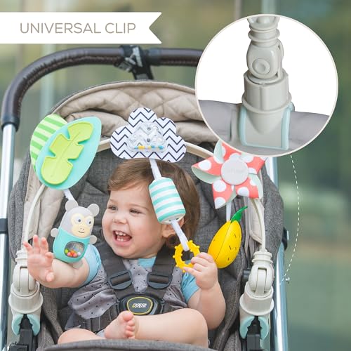 - Fits easily onto most prams, infant car seats or bouncers by means of two large sturdy clips.