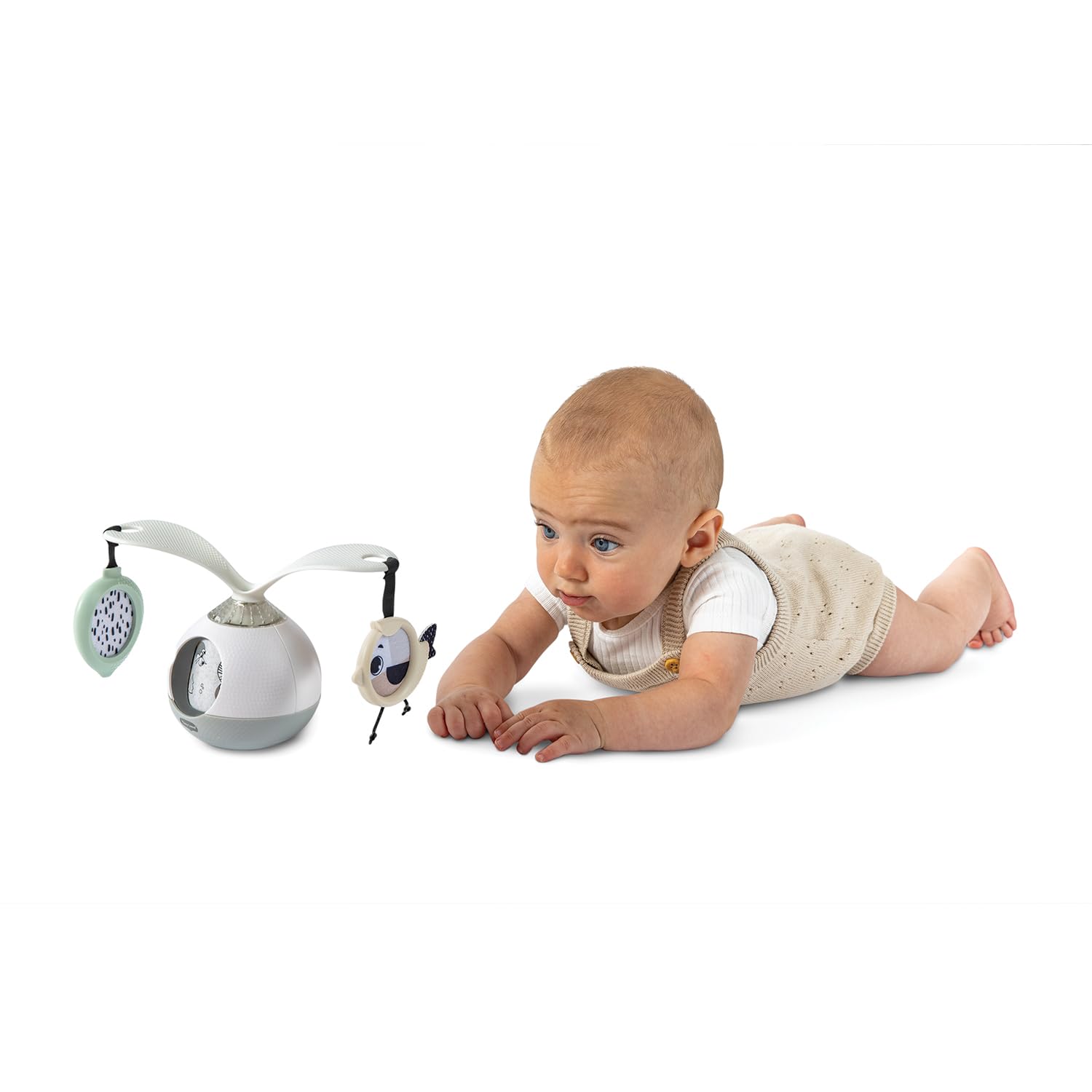 - 0–2 MONTHS – SENSES & EQ: Place mobile at the appropriate distance from baby (around 25cm away) and let them enjoy the engaging sound and movement while in tummy time, helping them gradually stay in the position a little longer.