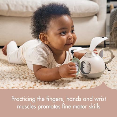 - 4–6 MONTHS – FINE & GROSS MOTOR SKILLS : As babies become more comfortable with spending time on their tummies, they will be able to lean on one hand while playing and moving the mobile with the other.