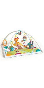 - TINY FRIENDS: this playmat for babies comes with large-eyed, smiling characters and stimulating activities – peek-a-boo activities, crinkly toy, teether, satin ribbons, ring for attaching extra toy and a mirror