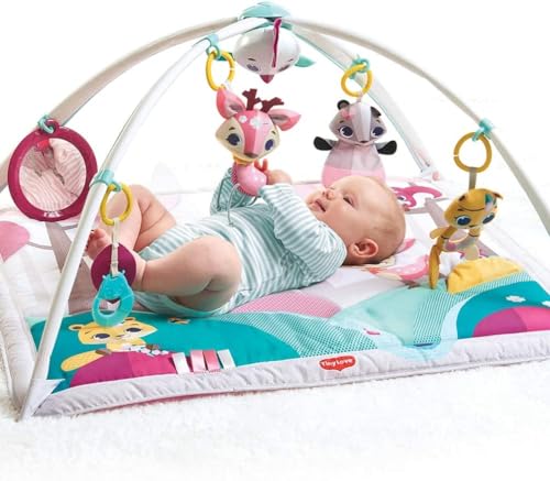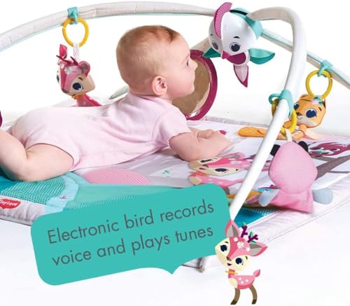 - TINY FRIENDS: the playmat comes with large eyed, smiling characters and stimulating toys: a crinkly blanket and peek-a-boo game, soft rattling and jittering toy, squeaker, teether and a large mirror