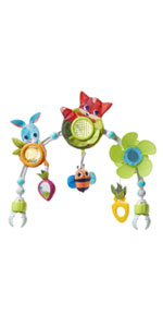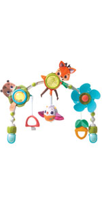- Rattle toys, crinkly textures and baby-activated fan on this baby activity bar encourages development in a fun way