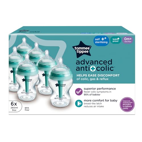 Tommee Tippee Advanced Anti-Colic Baby Bottles for 0m+, Pack of 6 260ml Baby Bottles, with Slow Flow Breast-Like Teat for a Natural Latch, Self-Sterilising and BPA Free, Baby Feeding Essentials