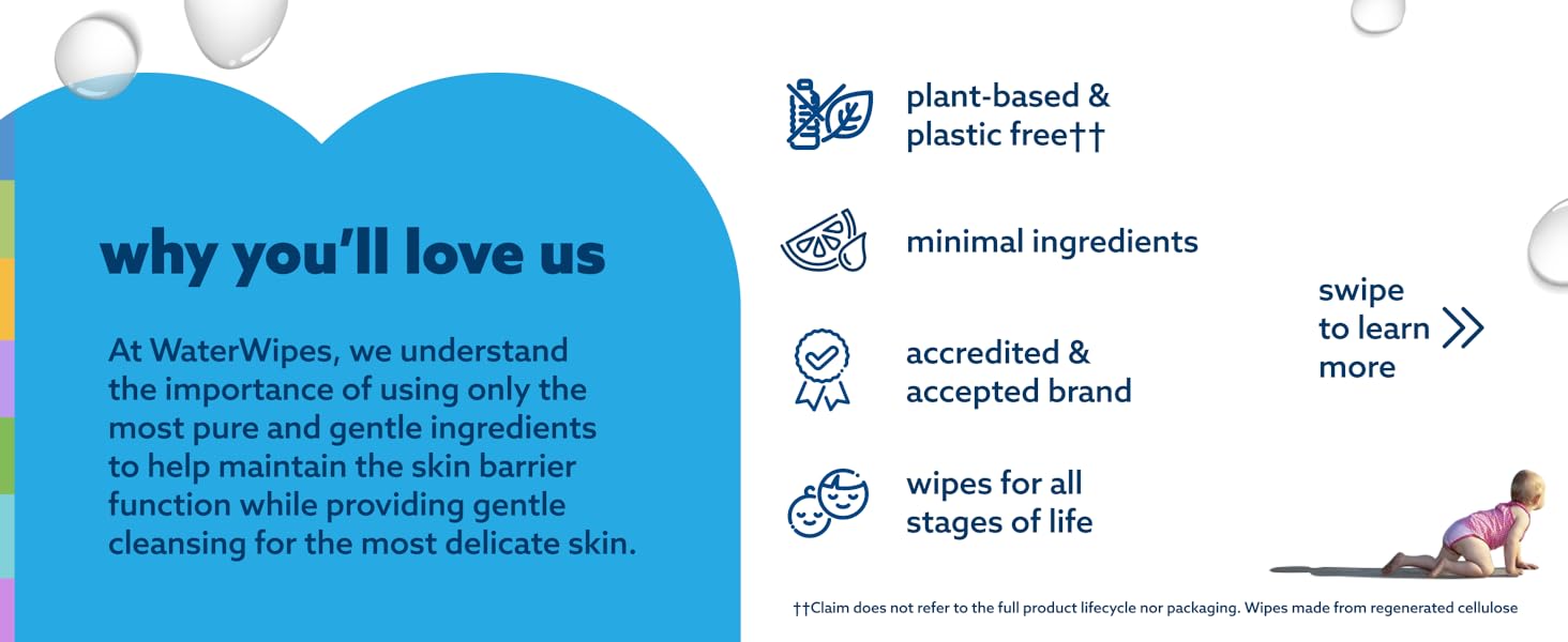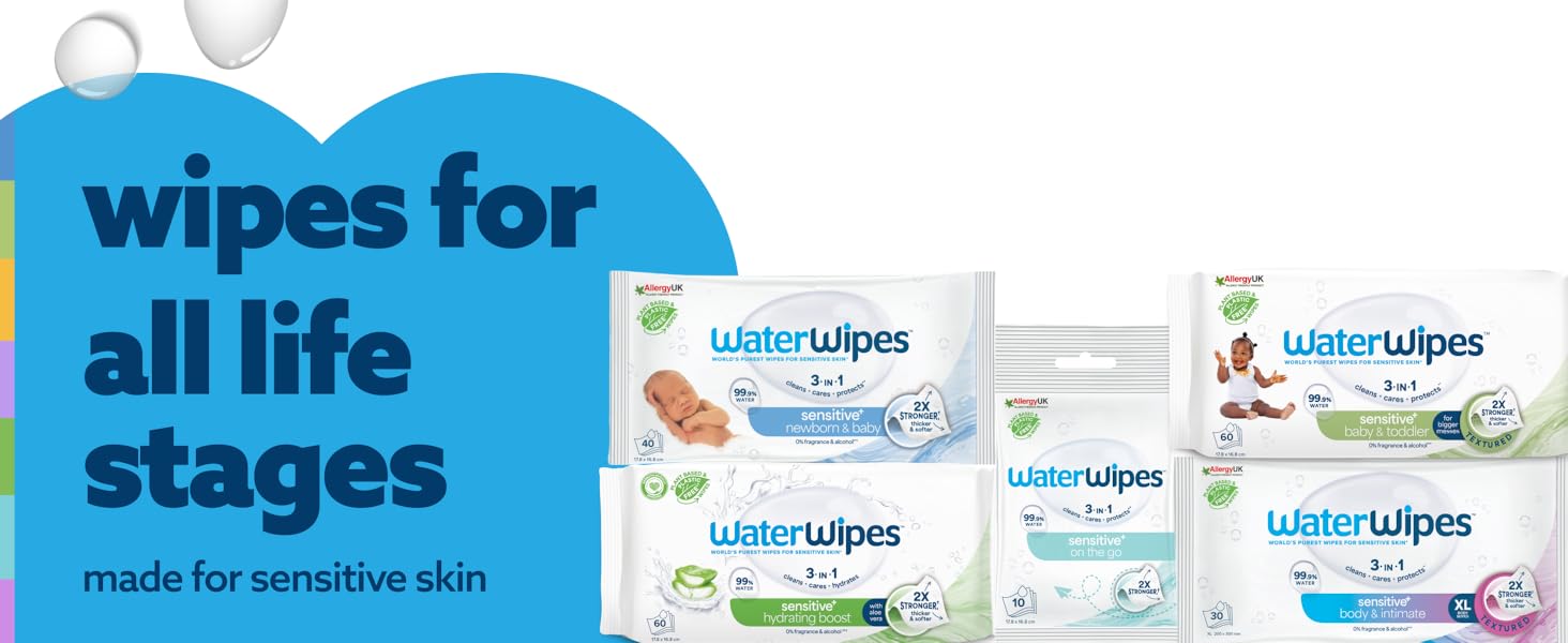 Introducing New & Improved WaterWipes, the World’s Purest Wipes for Sensitive Skin. Families can continue to trust WaterWipes Sensitive+ Baby & Toddler Wipes to gently clean, care and help protect sensitive skin – now with a 2X stronger†. Thicker and softer wipe, and a fresh new look. Our plant-based & plastic free†† wipes maintain the same purity, with just three carefully selected ingredients: 99.9% ultra-purified water and a drop of fruit and berry extract. Our ultra-purified water undergoes a 7-step process, making it even purer than tap, boiled, or bottled water. WaterWipes remain unscented and gentle on sensitive skin. They are kind to baby’s skin—giving parents the confidence to help protect their children in the purest way possible. WaterWipes was born from a father’s love—our founder created these wipes after his newborn suffered from nappy rash realising that skin this pure deserves care that’s just as pure. That inspiration led to the creation of the world’s purest wipes for sensitive skin, trusted by families worldwide for everything from nappy changes to messy hands and faces. †material than previous WaterWipes™ ††Claim does not refer to the full product lifecycle nor packaging. Wipes made from regenerated cellulose.