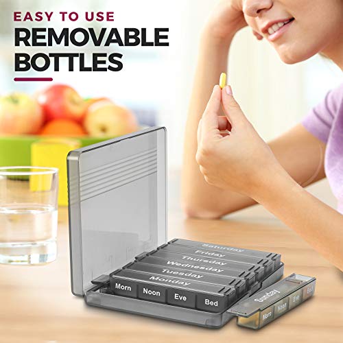 Weekly Pill Organizer – 7-Day Pill Case w/Removable Daily 4 Times-a-Day Pill Cases – Large AM/PM Medicine Pill Box for Medications Pills Vitamins & Supplements – Easy to Read Labels Monday to Sunday