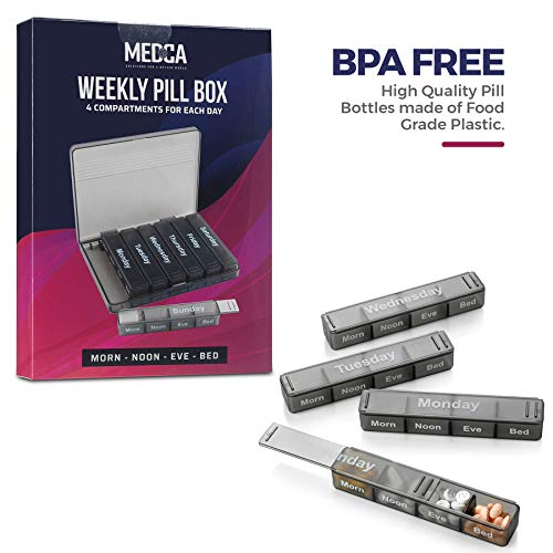 - LARGE SIZE – WEEKLY PILL ORGANIZER: The MEDca weekly pill organizer offers individual daily pill organizers with 4 compartments for morning, day, mid-day & night. Each individual container has an inner compartment size of 4.75 x 1 x .75 inches. That's more than enough space to hold around 10 fish oils, 12 vitamins, and 15 capsules per day. No need to take out all the bottles when you take your medication. You can have all of them easily accessible in one place