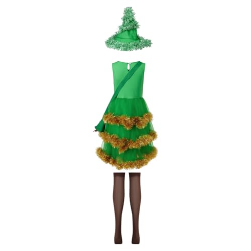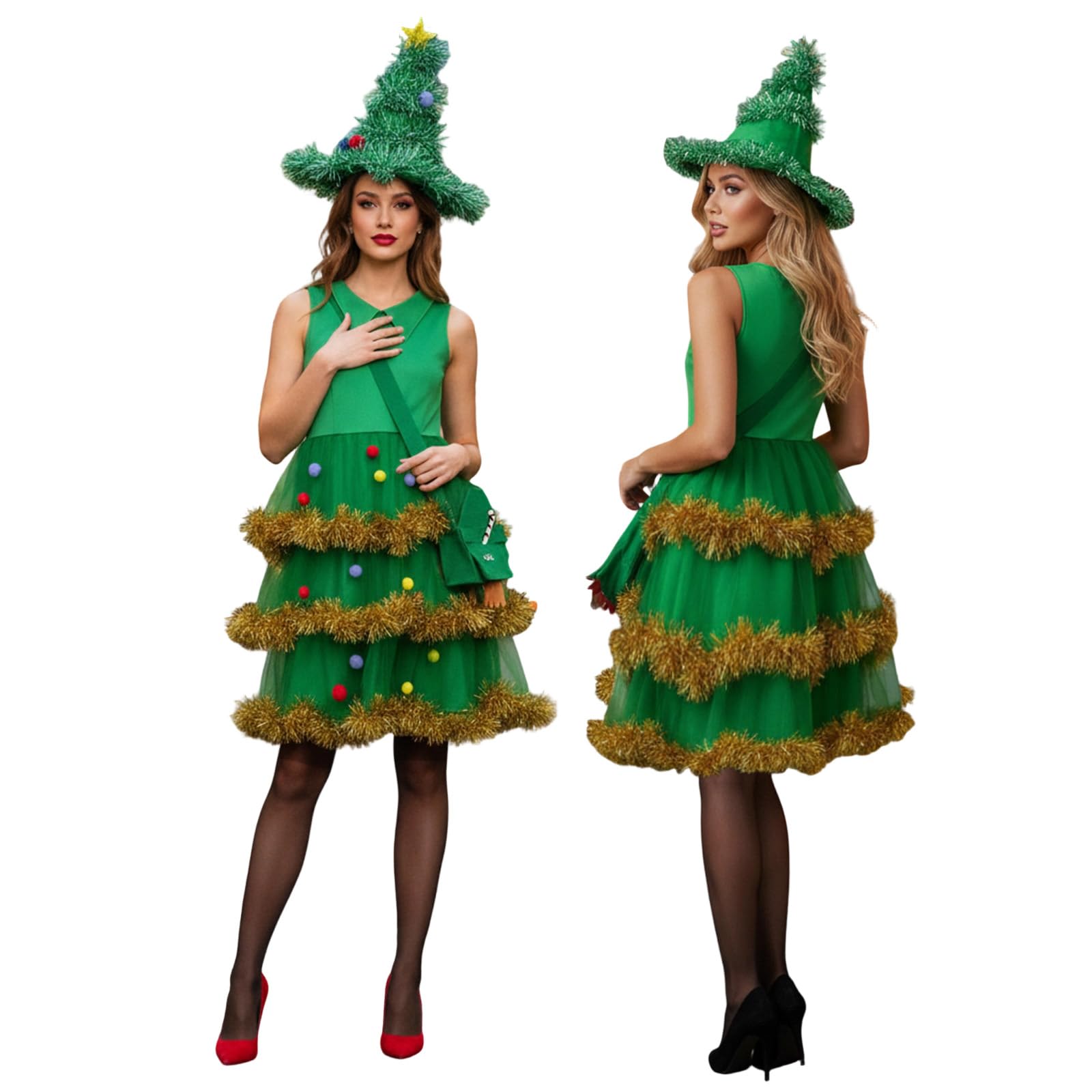 4 Pcs Christmas Tree Costume Set For Women Funny Outfit Tinsel Trim Christmas Tree Hat+layered Mini Dress+Stockings+Bag Holiday Se