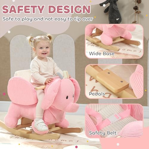 AIYAPLAY Kids Rocking Horse, Baby Ride on Elephant Rocker with Safety Belt and Sound Effects, Rocking Animal for Toddlers 18 to 36 Months, Pink