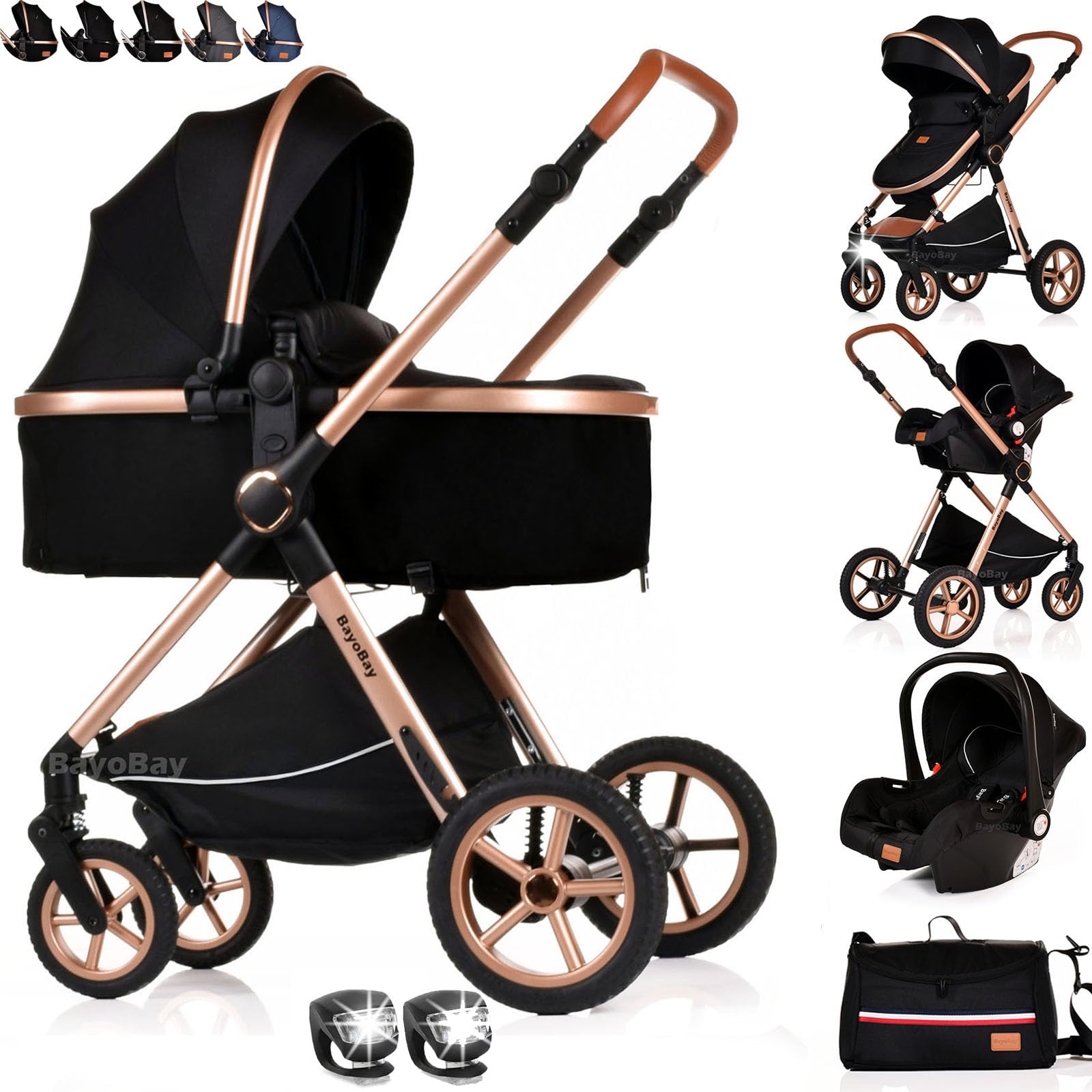 Baby Buggy Pram Pushchair Stroller 3 in 1 with Car Seat Carrycot Child Lightweight Folding Stroller Travel System Pram for Newborns & Toddlers from Birth (BBA – Black Gold, BBA)