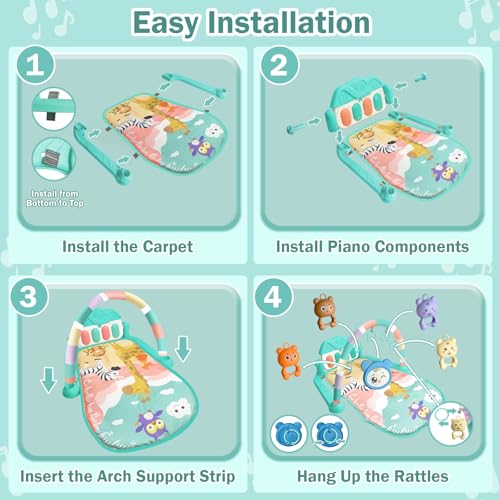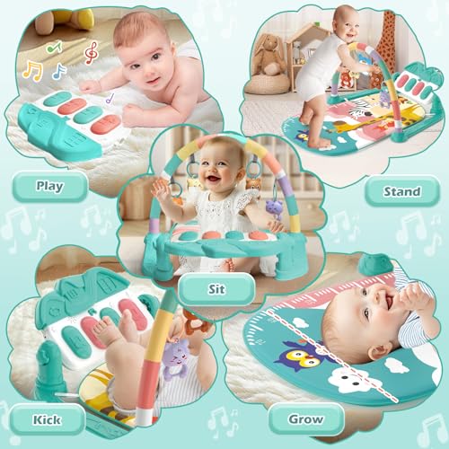 Baby Play Gym Mat 0-6 Months, Baby Activity Mat with Detachable Piano Panel and Hanging Rattles Toy, Sensory Kick and Play Piano Playmat for Babies 0-12 Months (Green)