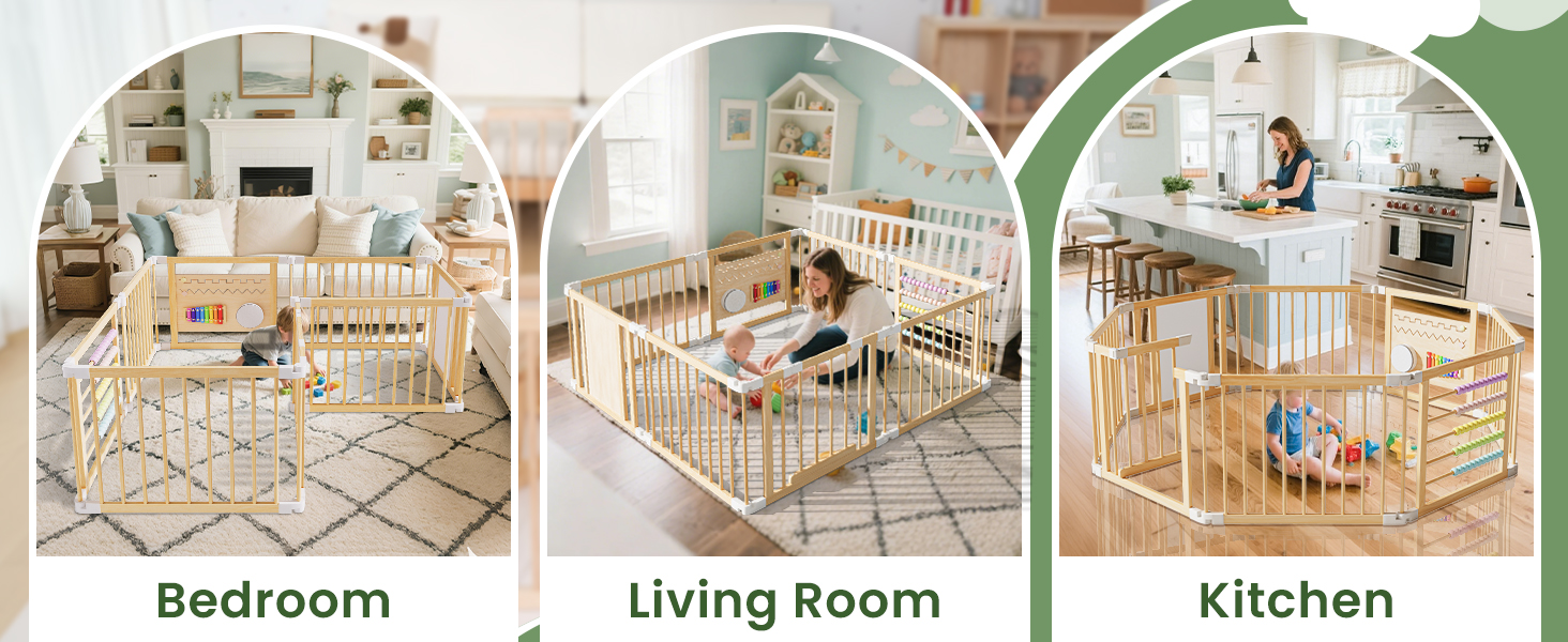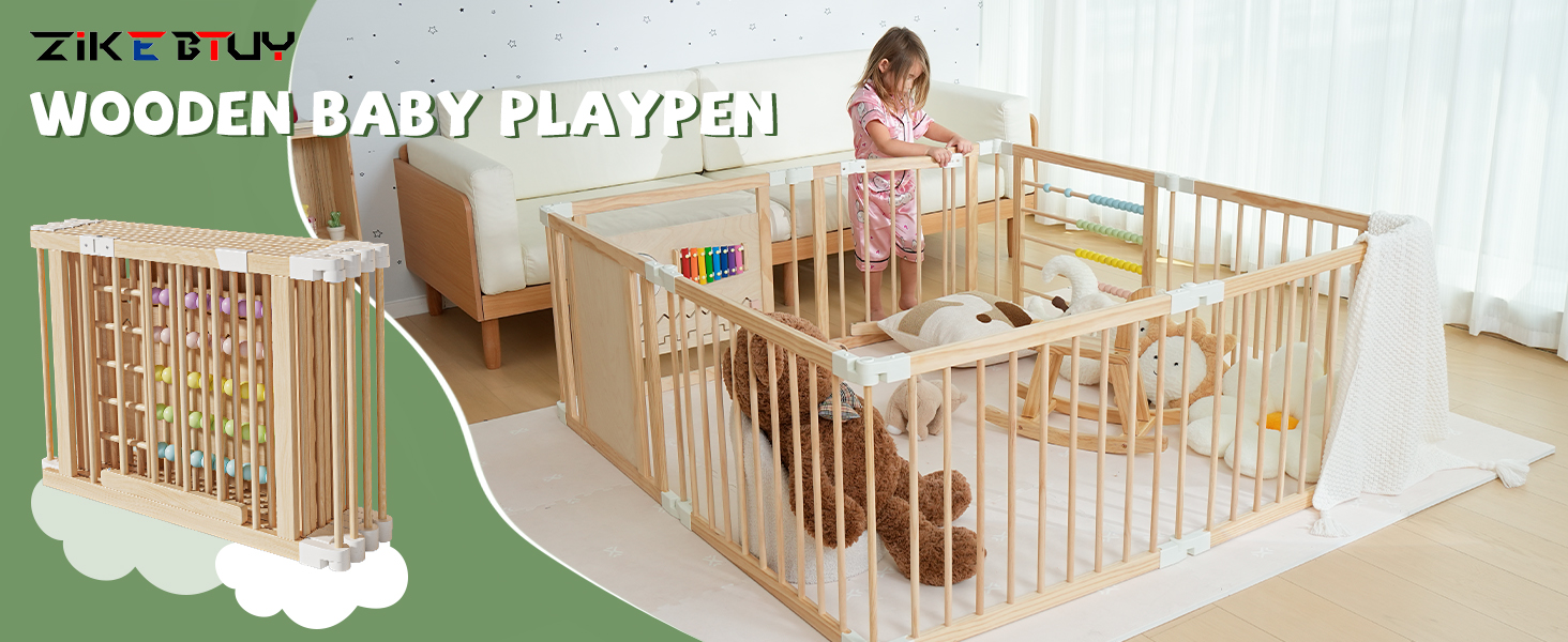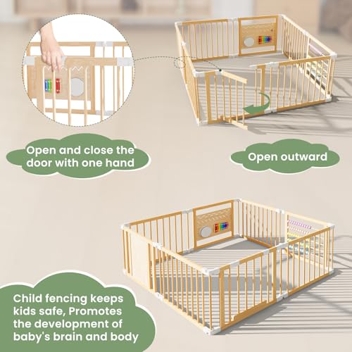 - 【Convenient Design】The locked playpen gate will not be opened by the baby's probing touch, but for parents, they only need to press and lift it to open the wooden playpen door with one hand. The door can be opened facing outward, providing you with more convenience.