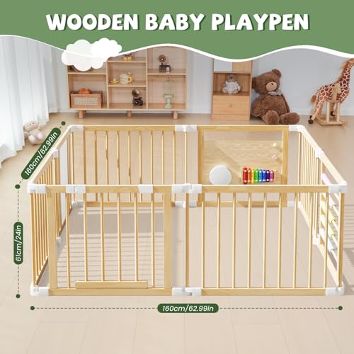 Baby Playpen 160x160x61cm Wood Playpen Foldable Baby Fence fold Away Play Pen with Musical Toys and Door Portable Easy Assembly Playpens for Babys & Toddlers