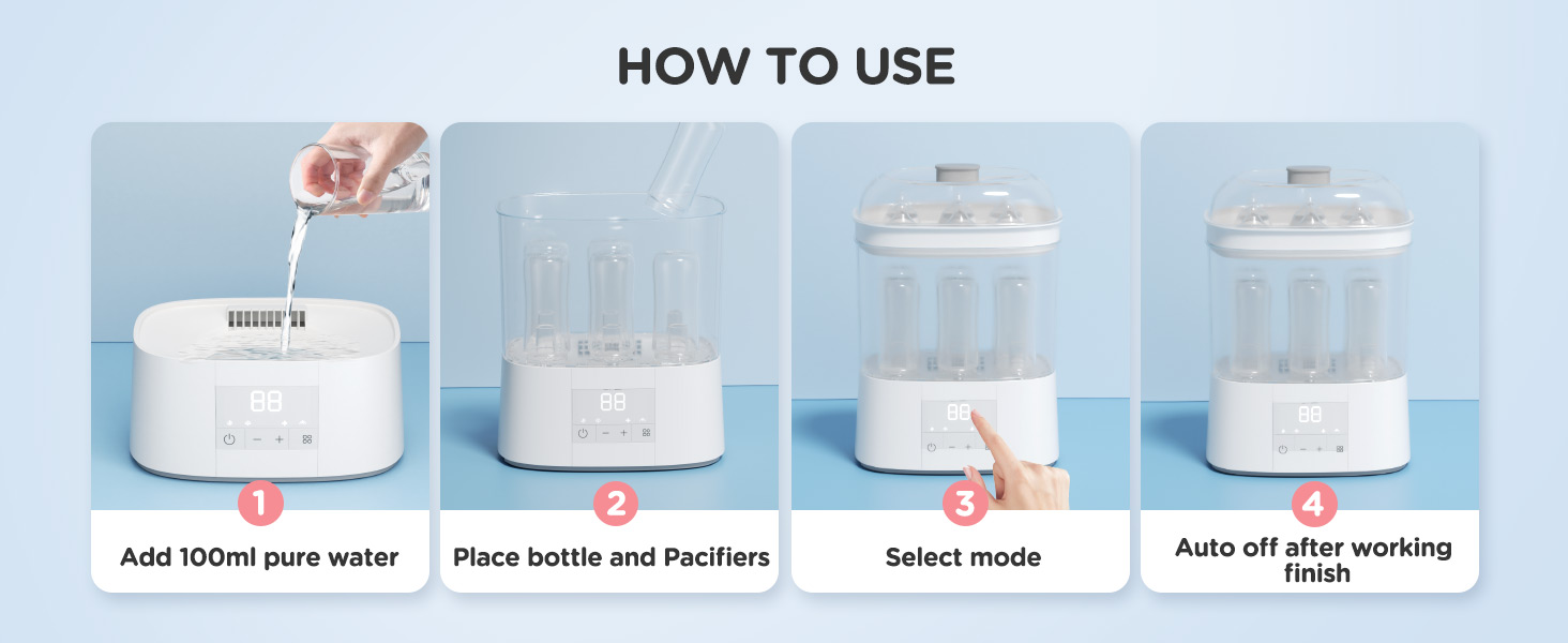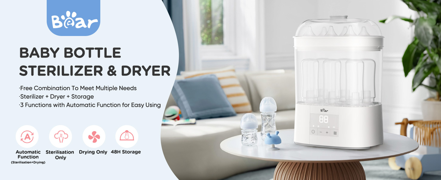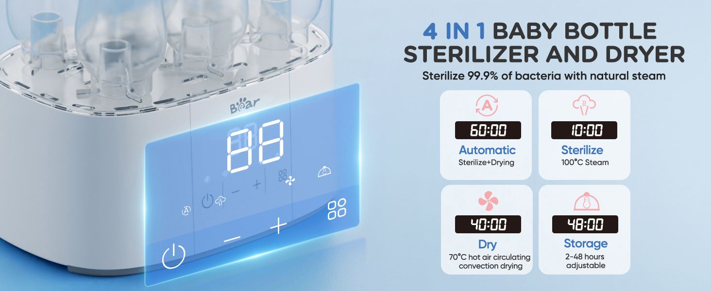 - 4-in-1 Functionality & Fast and Efficient: Offers multiple functions including automatic function (Sterilize + Dry), sterilize only, dry only and storage function. Sterilizes in just 10 minutes and features a rapid drying function that takes only 40 minutes. This versatile baby bottle steriliser saves you time and effort