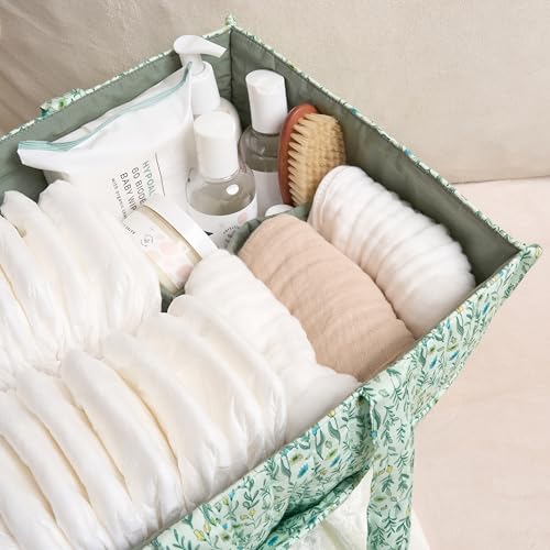 - Created with Organic Cotton Fabric: Our baby diaper caddy is crafted with luxurious organic cotton fabric for a soft natural feel Designed in England, crafted in India Our nursery organiser is available in two nature-inspired colourways: Spring Green – A vibrant, joyful nature pattern that brightens any nursery Linen Leaf – A minimalist design with soft green leaves, perfect for neutral nursery decor