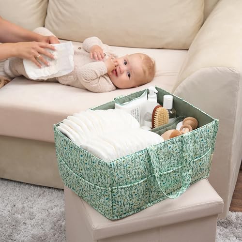 - Practical Details: Dimensions: 36cm (L) x 25cm (W) x 18cm (H) – large enough to store newborn baby essentials Material: Organic cotton fabric Weight: Lightweight and portable for everyday use Storage: This diaper caddy fits nappies, wipes, creams, breast pump parts, toys, snacks, and more Use It Anywhere: Nursery, baby changing station, living room, car, garden, or while travelling Folds Flat: Easy to tuck away when not in use. Made from soft cotton with quilted sides for structure Care Instructions: Spot clean with mild soap and water