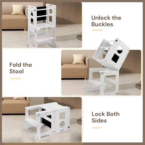 - [3-in-1 Foldable Montessori Learning Tower]: This versatile toddler step stool effortlessly transforms from a safe standing tower into a child-sized table and chair set. The attached chalkboard encourages creative play, making it a perfect multi-functional helper for growing kids.
