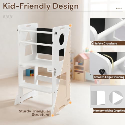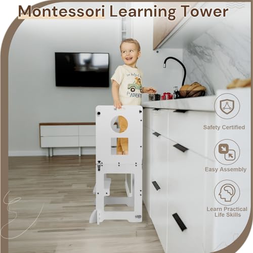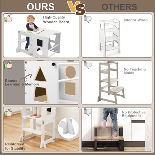 - [High Quality and Educational Features]: Crafted from high-quality pine wood and durable multi-layer board, this learning tower is built to last. The geometric cut-outs and chalkboard aid in learning and memory development, while supporting practical life skills.