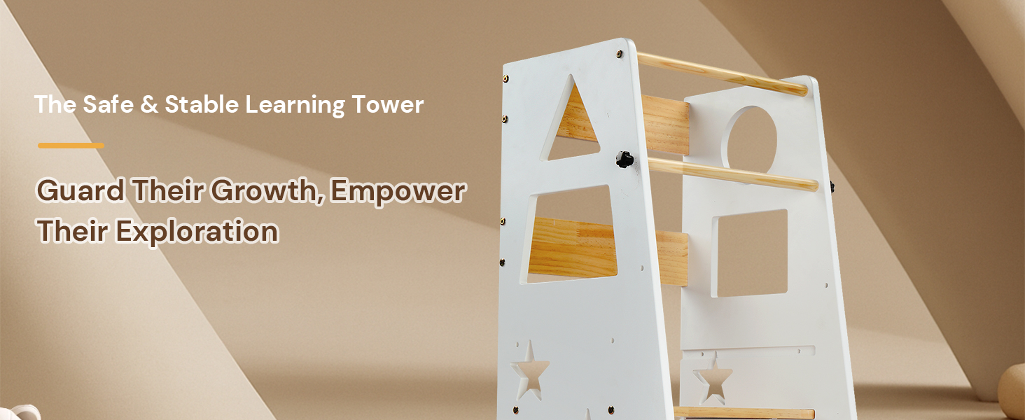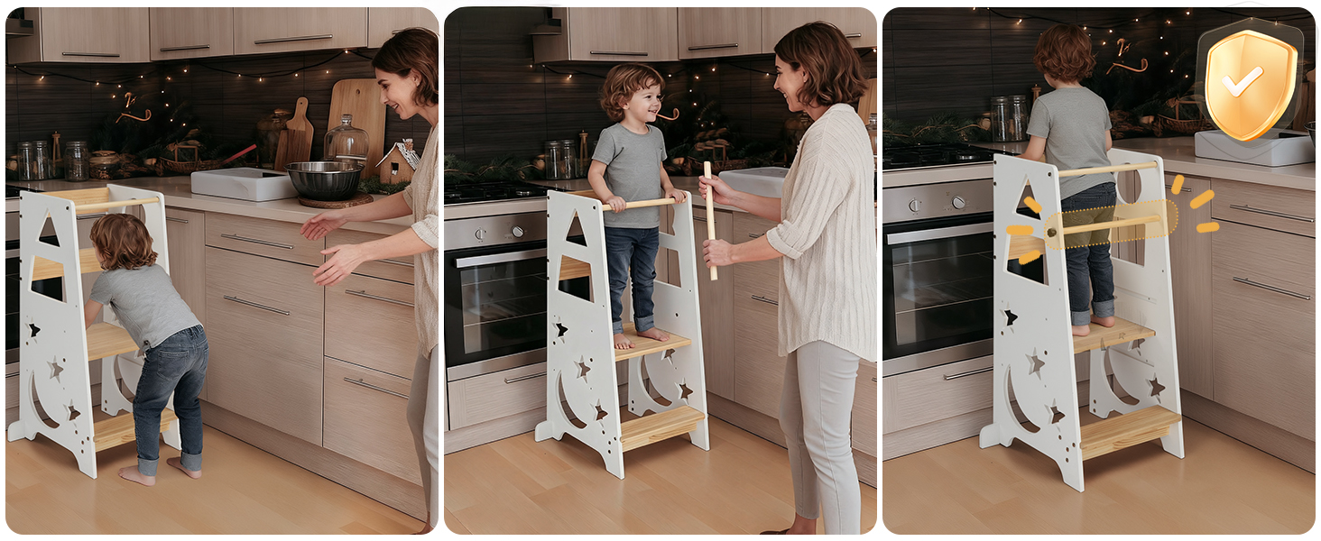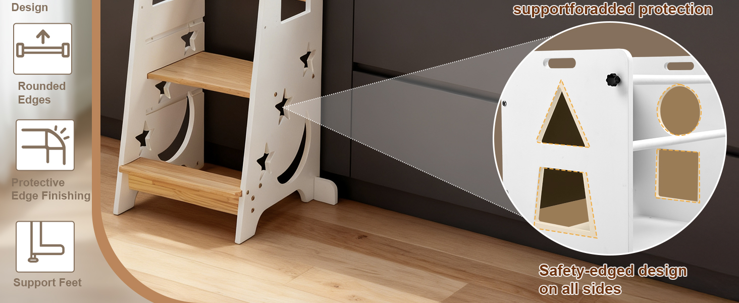 - [Educational Engagement Design]: The geometric and moon-shaped cutouts serve as both safety handrails and learning tools, helping children develop pattern recognition while encouraging participation in household activities and practical life skills.